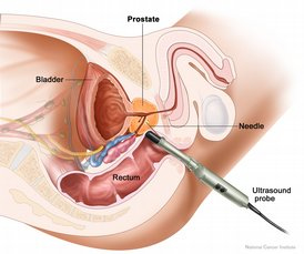 The probe is inserted into the rectum. The needle has to go through the thin rectal wall into the prostate